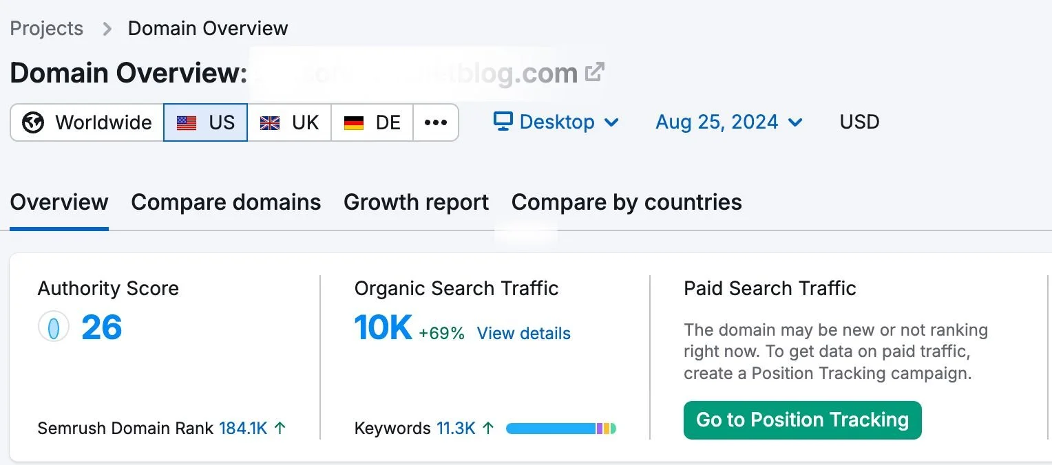 This is an example of a Semrush domain overview—a screenshot I took this morning of a website I manage. We're currently experiencing a surge in organic search traffic after I updated eight posts over the past two months. I monitor these metrics weekly (okay, sometimes daily) to ensure we're on the right track.