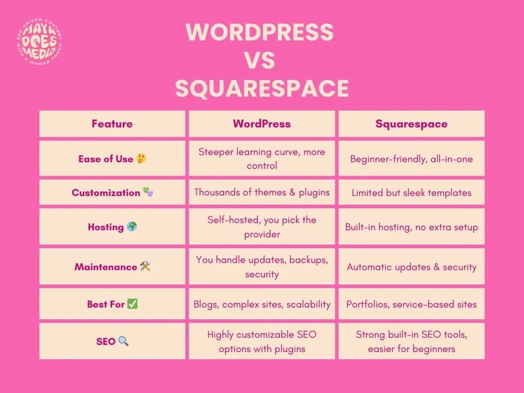 It depends on what kind of experience you want. WordPress offers more customization and flexibility but requires more setup and maintenance, making it ideal for bloggers and businesses that need scalability. Squarespace, on the other hand, is an all-in-one platform with built-in hosting and an intuitive interface, making it great for beginners or those who want a sleek, hassle-free website.